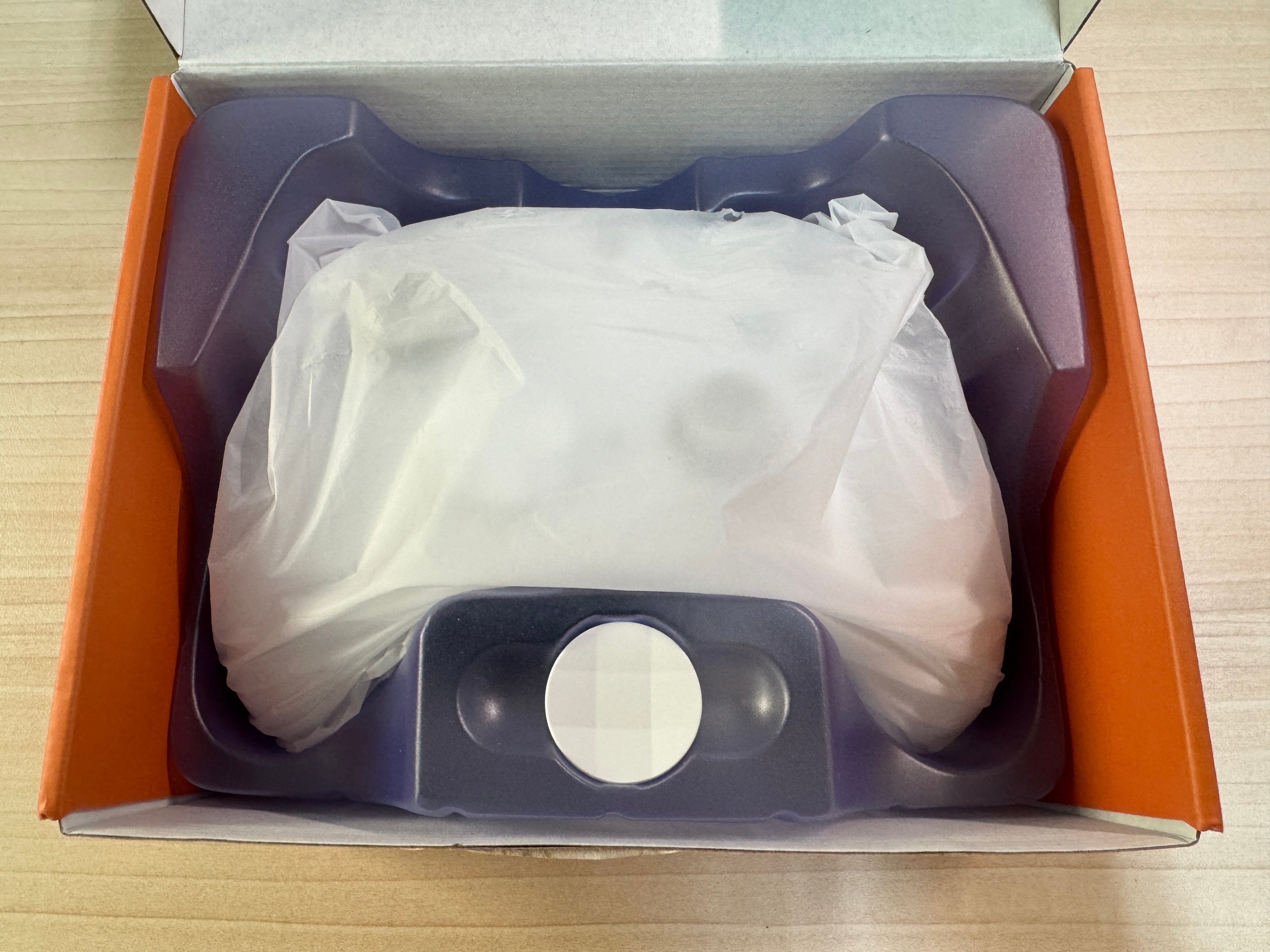 從外盒下方向上掀起,打開就可以看到《沛影手把》本體,因為有塑膠膜與模板的保護,不太需要擔心手把產生損傷,而中間下方那顆白色圓圓的,則是給玩家替換用的“十字鍵”1 個;接著把模板移開後,裡面還有約 0.8 公尺的“Type-A to Type-C 充電線”1 條與多語言“產品使用說明書”1 本。