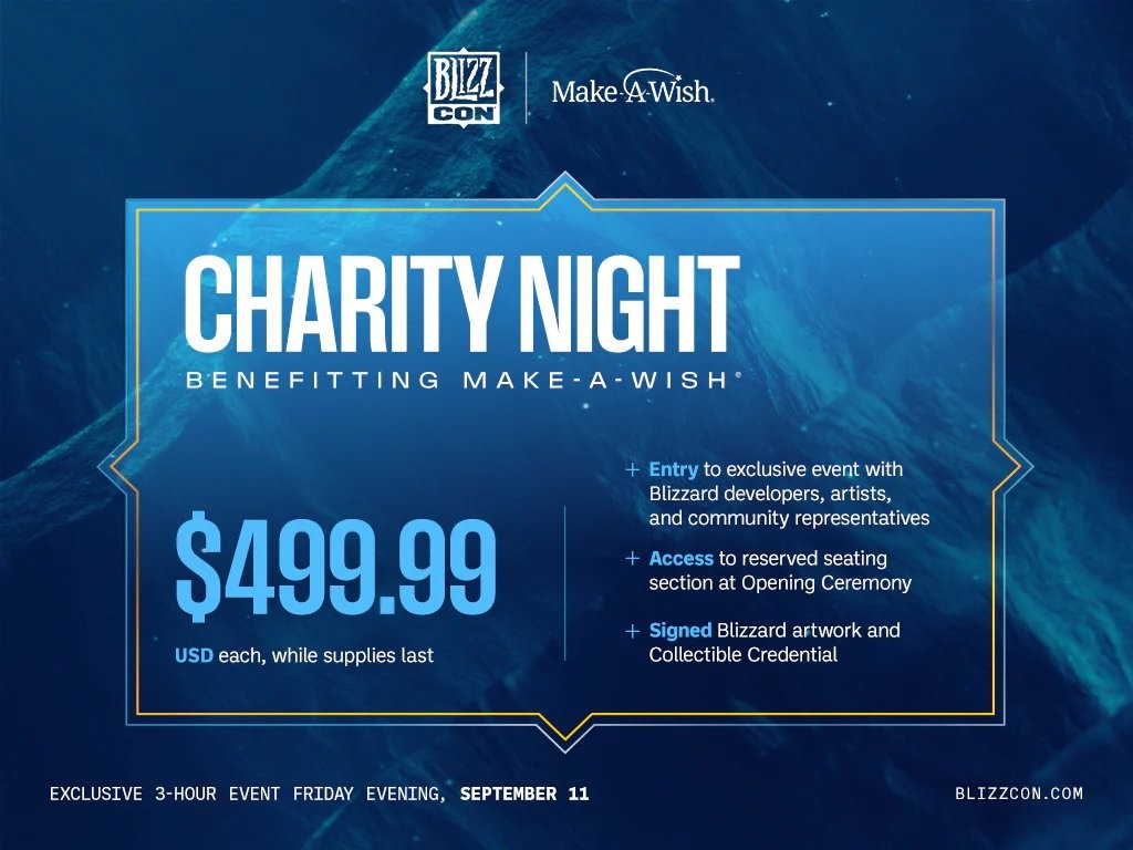 - 通行證追加內容「BlizzCon慈善之夜」:此通行證追加內容將包括 BlizzCon 慈善之夜開幕典禮的專屬座位、一件簽名版的暴雪美術品,以及一張收藏版紀念證。全包價為 499.99 美元,售完為止。扣除所有退單或退款後,暴雪娛樂將把此追加內容的銷售所得全數捐贈給 Make-A-Wish。