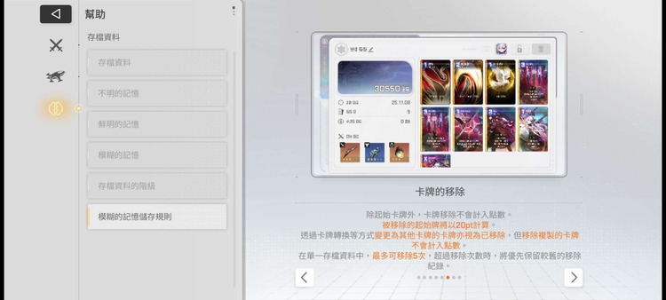 玩家可自由套入公式「30+(階級數-1)*10」來計算容量上限,各個“模糊的記憶”占用的 pt 數請參見計分規則。