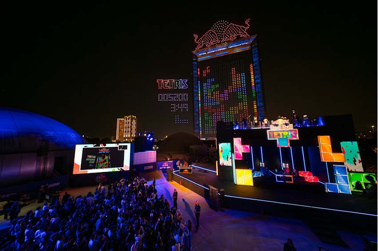 4,000 drone light show lights up the sky for the Red Bull Tetris World Final in Dubai.