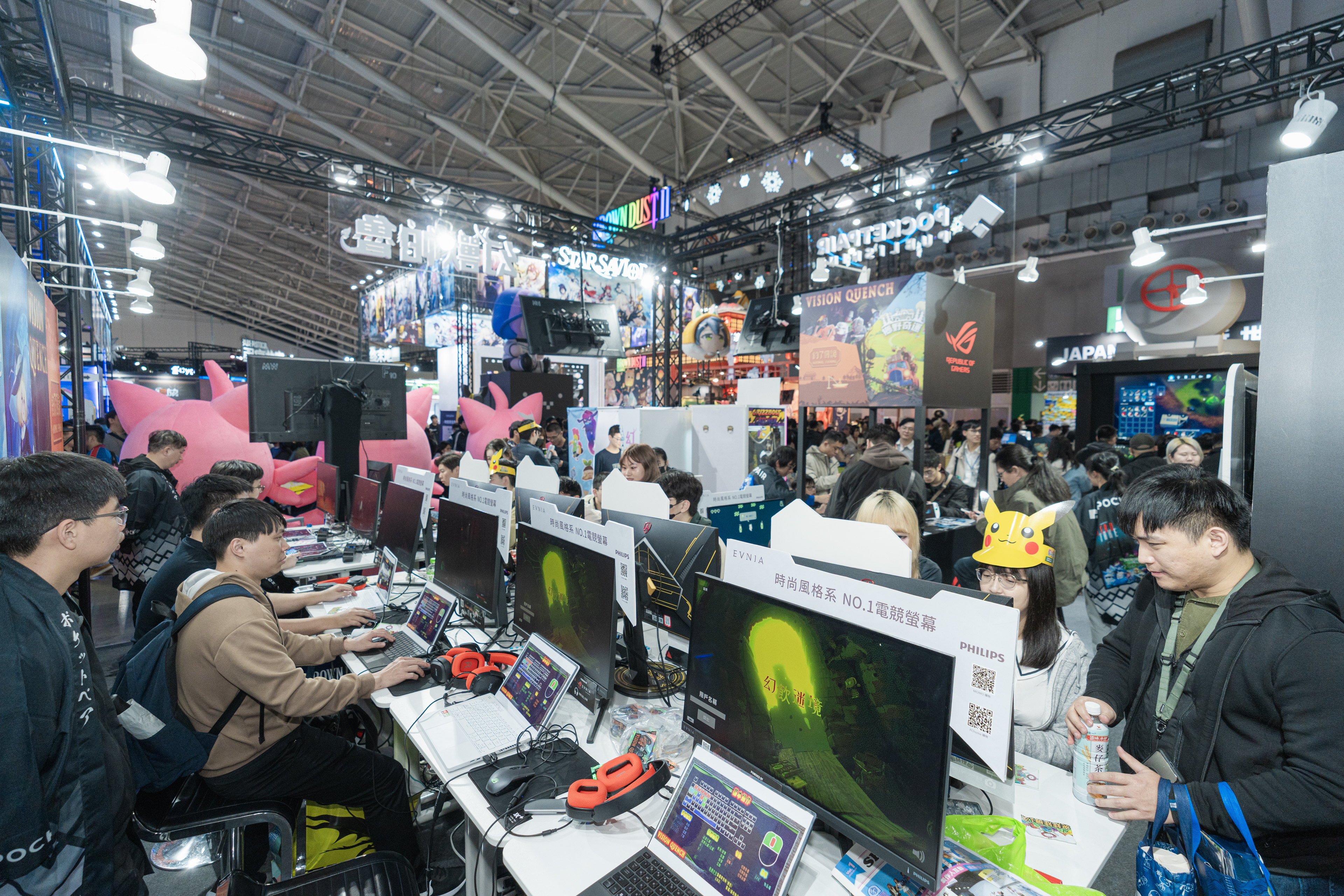 還有《碧藍航線》打造的艦船宿舍計畫,30個限量名額超快就被忠實玩家搶空,帶著滿滿的笑容與化身艦船少女的Coser一對一互動,格雷維蒂互動則有超萌的月夜貓現身,為仙境傳說系列最新作品《RO仙境傳說:世界之旅》帶來滿滿人氣,首次在台灣與玩家見面的《塵白禁域》推出的限量背包大受好評,幾乎展內處處可見玩家揹著輕鬆逛展,許多展場限定的周邊也幾乎都被搶購一空,顯見遊戲的超高人氣;由 Game Source Entertainment 帶來,全球首度開放實機試玩的《星砂島》,療癒可愛的氛圍,備受親子族群喜愛,有許多家庭大手拉小手,一起打造虛擬世界中的家園。