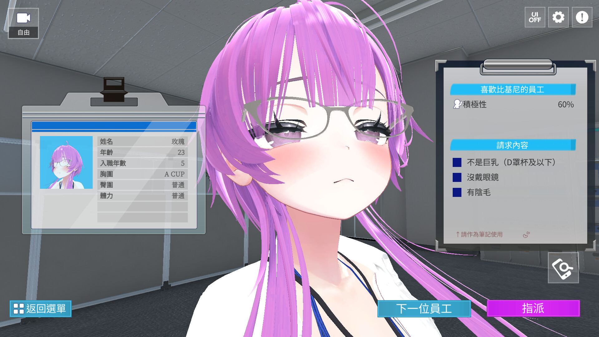 分配的員工可以隨意更改外貌,通過胸部控制,可以自由調整貧乳或巨乳!還有髮型、髮色、眼鏡、陰毛有無、輪廓調整等各種選項!