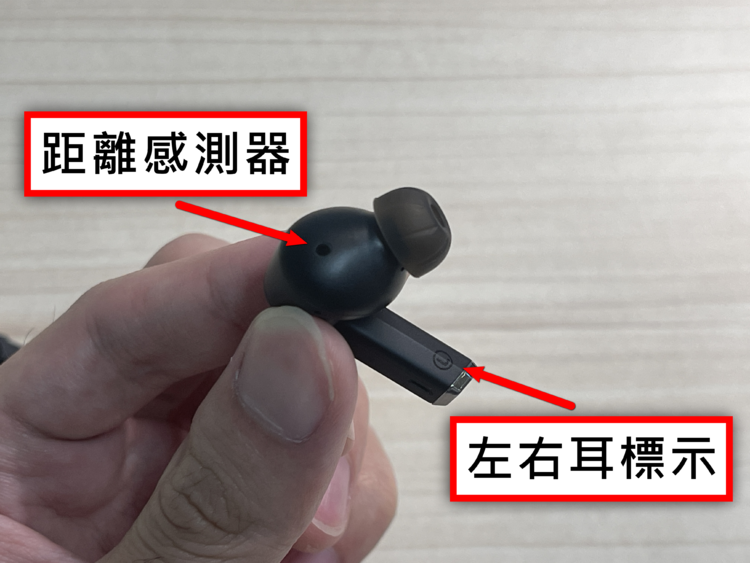 接下來簡單介紹耳機的硬體設計,讓大家對《AERO PRO》有個基礎認識。首先在耳塞與出音孔的部分,結構相當直觀,這裡就不多加贅述;而機身附近那顆透明的小圓點,則是用來偵測耳機是否離耳的距離感測器。
