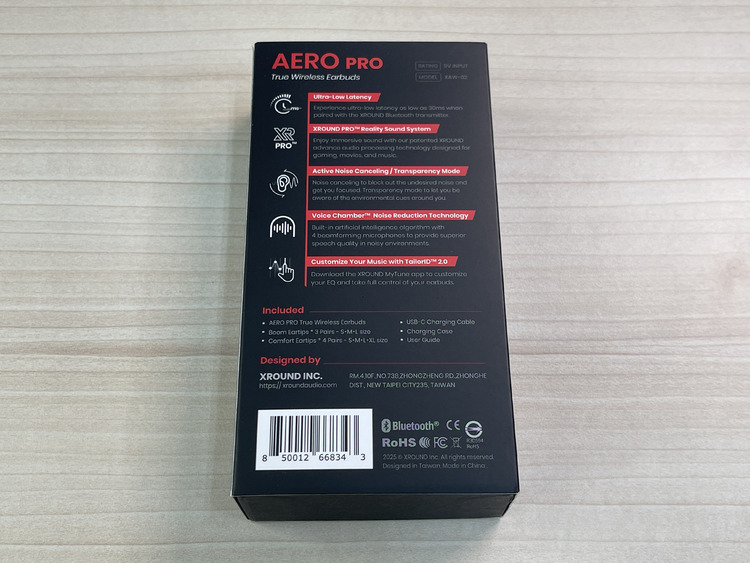《AERO PRO》採用外皮與內盒的雙層包裝設計。外層以深黑為主調,搭配亮紅點綴,呈現電競產品常見的經典配色,似乎也在偷偷暗示其「電競取向」的定位,藏著一點小巧思。正面印有耳機本體的預覽圖,背面則以清晰的白色文字與圖示,條列標示其支援的各項特色功能。