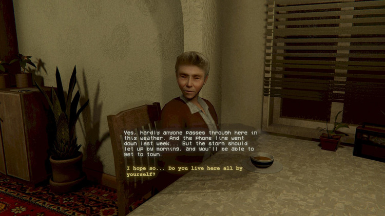 當她恢復意識後,不僅手機失去訊號,窗外的風雪也愈發猛烈。別無選擇之下,她只得離開車輛,徒步走入森林尋求協助。所幸不久後,她發現一間老舊的房屋,一位和藹的老婦人將她迎入屋內,提供溫暖、熱茶,以及暫時歇息的空間。