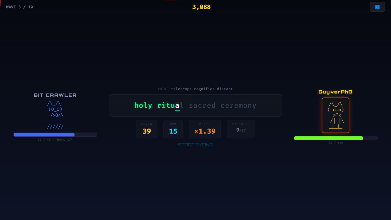 《Typers Combat》是由開發商 Esoteric Games 所製作的文字對戰遊戲,對戰過程中,螢幕會隨機出現長短不一的句子,玩家必須在極短的時間內正確敲擊出來,打字的速度越快,對敵人造成的傷害就越高,一旦出錯或節奏被打亂,連擊數便會中斷,敵人也會趁隙反擊。