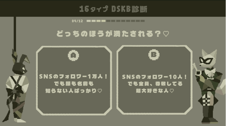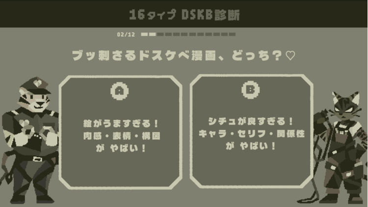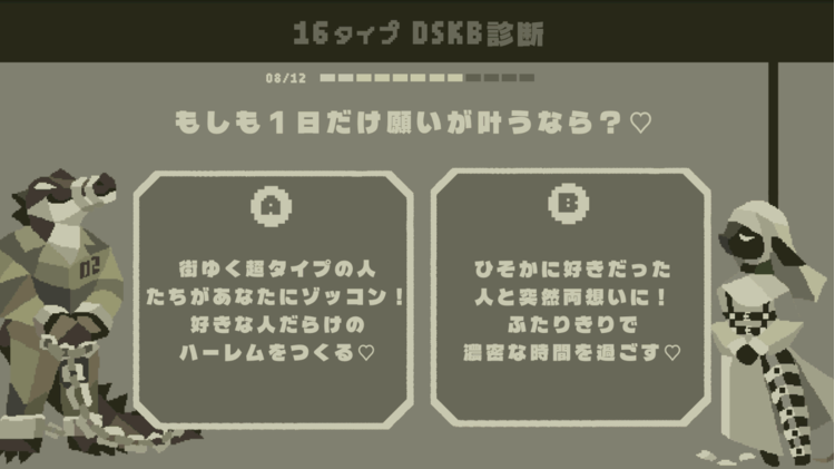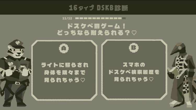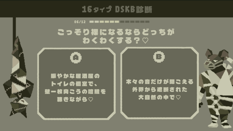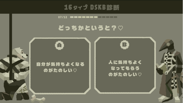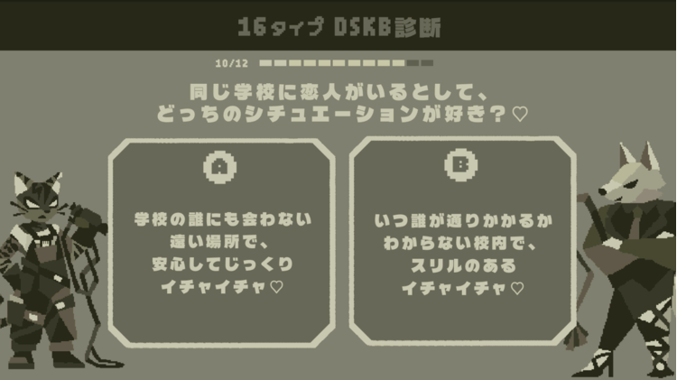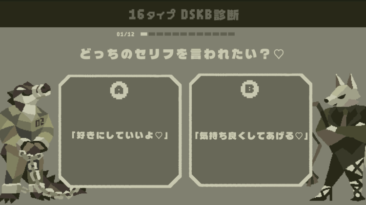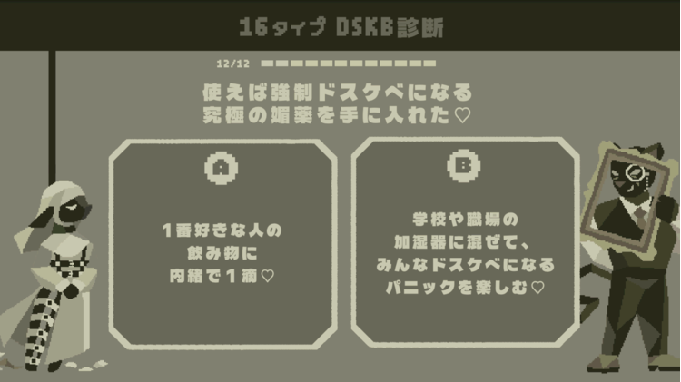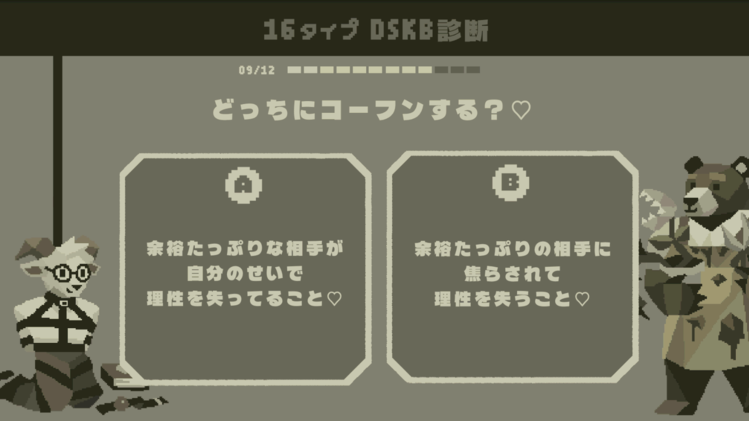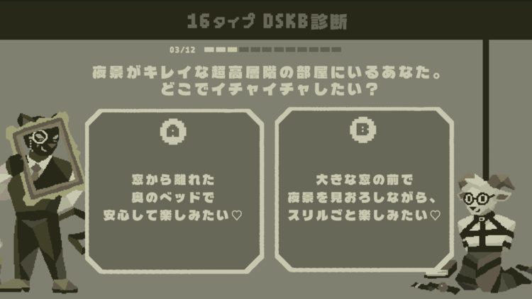 不過比較可惜的是,《16 DSKB Types》目前僅支援日文介面,閱讀上可能會稍微有些吃力。因此這邊也簡單整理並翻譯這 12 道題目,方便讀者深入了解自己的色色傾向。《16 DSKB Types》目前正在 Novelgame 網站上免費公開,可透過手機或電腦瀏覽器遊玩。