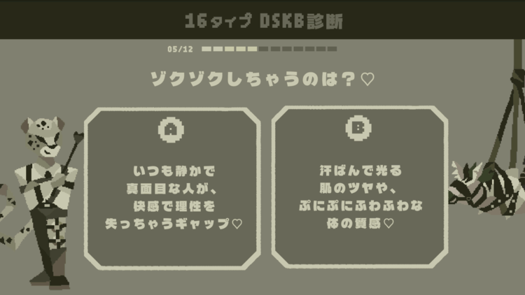 《16 DSKB Types》共設計 12 道題目,內容涵蓋多種情境描述,並提供兩個選項供玩家選擇,只需憑直覺作答即可,整體測驗約 5 分鐘便能完成。完成測驗後,系統將依據結果為玩家分析最符合的動物角色,並進一步解析其「色色傾向」,同時找出與玩家相性最佳、最容易讓人無法自拔的類型。